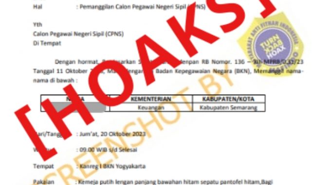 Berdasarkan hasil penulusuran, surat tersebut palsu. Melalui situs resmi Yogyakarta.bkn.go.id, humas Kanreg I BKN menegaskan rekrutmen CASN hanya diumumkan melalui media resmi pemerintah dan tanpa dipungut biaya. Kepala Kanreg I BKN, Paulus juga menambahkan BKN tidak pernah mengundang CASN untuk kumpul. Pemanggilan peserta akan dilakukan jika peserta dinyatakan lolos dan diumumkan melalui media resmi instansi.