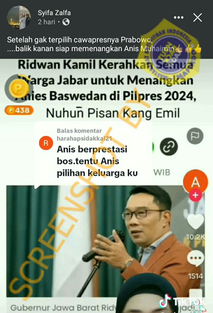 Beredar unggahan melalui media sosial Facebook, sebuah hasil tangkapan layar dari salah satu artikel yang dalam judulnya, menyebutkan bahwa Gubernur Jawa Barat, Ridwan Kamil, mengerahkan seluruh warga Jawa Barat untuk memenangkan Anies Baswedan dalam Pilpres 2024 mendatang. Akun bernama Syifa Zalfa ini, turut menyebutkan bahwa tindakan dari Ridwan Kamil ini didasari karena dirinya tidak dipilih menjadi bakal calon wakil presiden mendampingi Ganjar Pranowo. Namun apakah benar Ridwan Kamil mengerahkan seluruh warga Jawa Barat untuk mendukung Anies Baswedan pada Pilpres 2024?