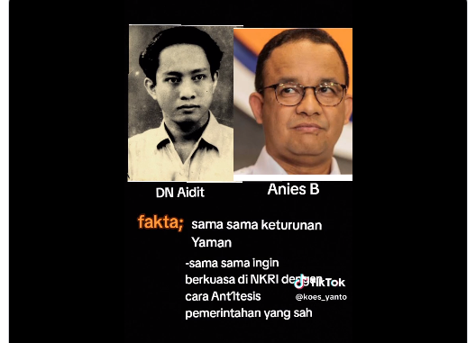 Sebuah akun Facebook mengunggah video yang menyandingkan foto mantan ketua Partai komunis Indonesia (PKI) dengan foto Anies Baswedan. Dalam narasi klaimnya disebutkan bahwa Aidit dan Anies sama-sama merupakan keturunan Yaman dan sama-sama ingin berkuasa di NKRI dengan cara antitesis pemerintahan yang sah.