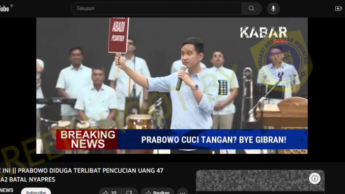 Kanal YouTube KABAR NEWS (https://www.youtube.com/@kabarnews672) pada 16 November 2023 mengunggah video dengan judul dan thumbnail yang mengklaim bahwa Prabowo Subianto terseret kasus dugaan pencucian uang senilai 47 triliun. Adanya keterlibatan Prabowo dalam kasus tersebut dinilai akan menggagalkannya sebagai capres pada Pemilu 2024.