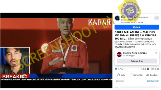 Akun News Era 2024 pada 23 Oktober 2023 mengunggah video yang berjudul "PRABOWO KETAR - KETIR MAHFUD NGAKU DIBAYAR 800 M JADI WAPRES PRABOWO". Unggahan yang berdurasi 9 menit 35 detik itu tidak menyampaikan berita tentang pengakuan Mahfud yang dibayar 800 M untuk menjadi cawapres Prabowo. Unggahan tersebut telah disanggah melalui artikel milik Tribunjogja.com yang menyatakan unggahan tersebut hoax. Hal ini bedasarkan apa yang tertulis pada judul dan cover dengan narasi yang dibacakan tidak sesuai. Narasi yang dibacakan tidak terdapat pernyataan tentang Mahfud MD yang dibayar 800 M untuk menjadi cawapres Prabowo.