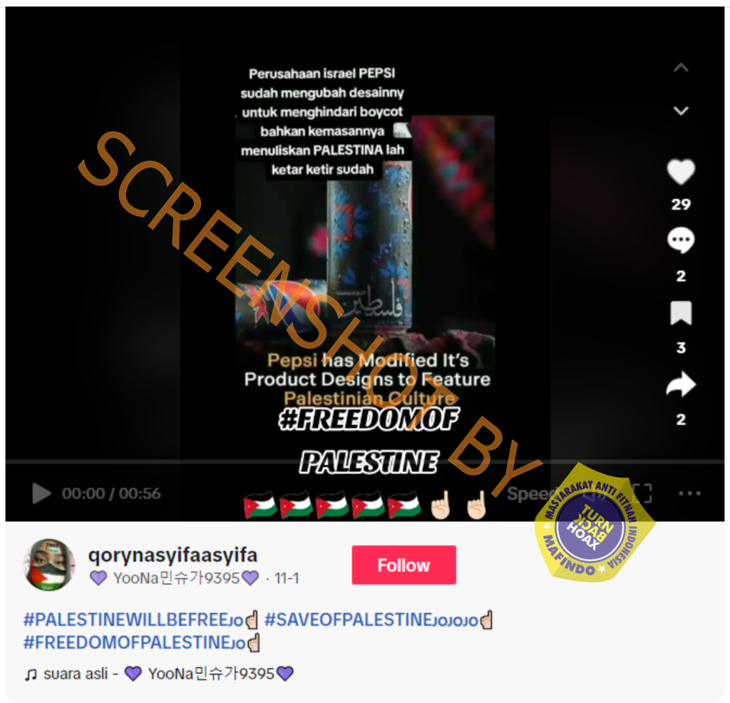 Sebuah video di TikTok membagikan kemasan baru Pepsi yang bertulisan “Palestina” dalam bahasa Arab. Narasi yang disematkan dalam video menyebut bahwa perusahaan Israel, Pepsi mengubah desain kemasan kalengnya untuk menghindari boikot.