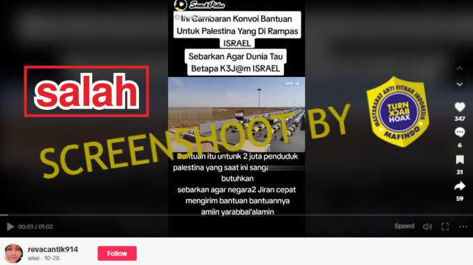 Sebuah video di Tiktok memperlihatkan banyak sekali truk yang terparkir memanjang, video itu juga disertai dengan narasi jika truk-truk tersebut merupakan bantuan untuk Palestina yang sedang dirampas Israel.