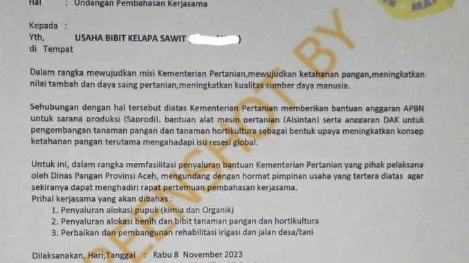 Beredar surat bernomor 055/Set.57.10/2023 memakai kop surat dan mengatasnamakan Dinas Pangan Aceh ditujukan kepada pengusaha kelapa sawit. Dalam surat tersebut membahas kerjasama terkait penyaluran alokasi pupuk, benih dan bibit tanaman, serta perbaikan dan pembangunan rehabilitasi irigasi yang dilaksanakan pada 8 November 2023 bertempat di ruang rapat Dinas Pangan Provinsi Aceh. Terdapat pula tanda tangan Plt Kepala Dinas Pangan Aceh, Surya Rayendra.