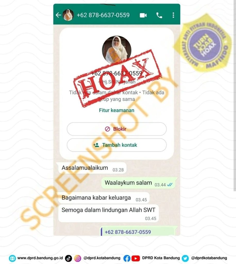Berdasarkan hasil penelusuran, akun WhatsApp tersebut merupakan penipuan. DPRD Kota Bandung melalui akun Instagramnya @dprd.kotabandung menjelaskan nomor tersebut bukan milik anggota DPRD Kota Bandung, Hj. Siti Nurjanah, S.S. Pihaknya juga meminta masyarakat mengabaikan jika mendapatkan pesan serupa dan jangan lupa melaporkannya.