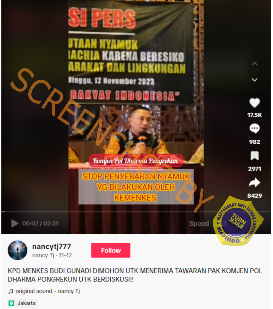 Sebuah video di TikTok membagikan informasi yang mengklaim nyamuk Wolbachia dapat dikendalikan oleh sistem digital dan terkontrol oleh gelombang untuk mengejar manusia, nyamuk tersebut adalah senjata untuk membunuh manusia.