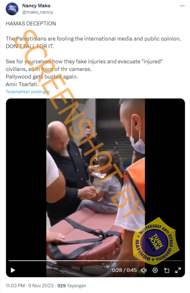 “PENIPUAN HAMAS Orang-orang Palestina membodohi media internasional dan opini publik. JANGAN TERPERCAYA. Lihat sendiri bagaimana mereka memalsukan cedera dan mengevakuasi warga sipil yang “terluka”, semuanya di depan kamera. Pallywood tertangkap lagi. Amir Tsarfati.”