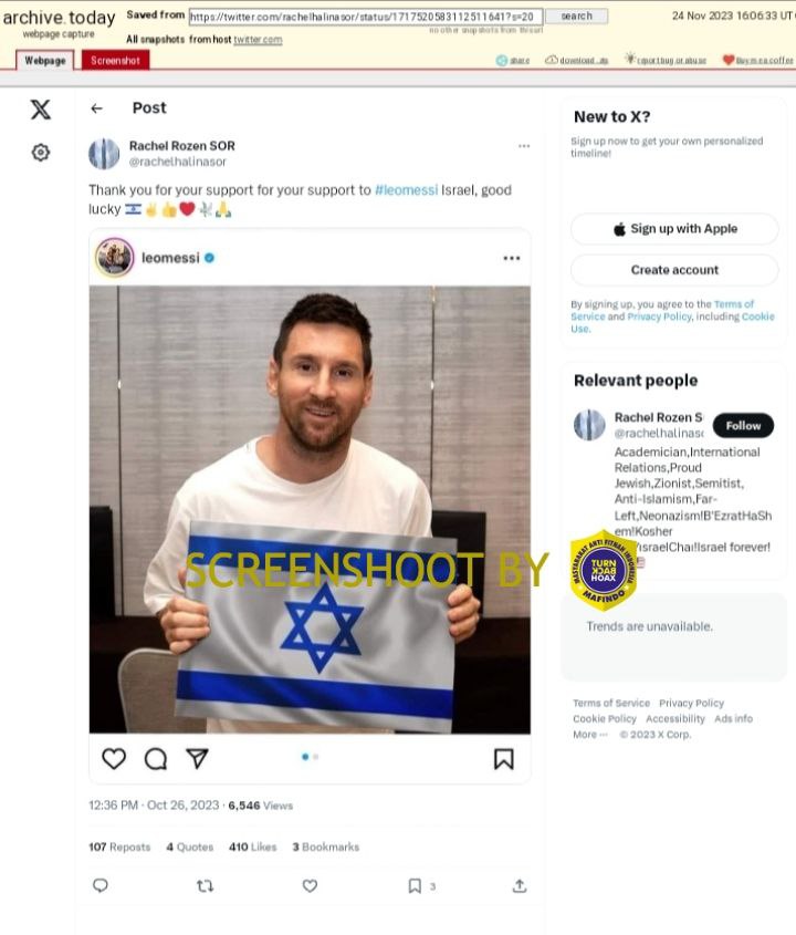 Akun Twitter @rachelhalinasor (RachelR ozen SOR) mengunggah tangkapan layar foto Lionel Messi memegang bendera Israel. Dari tangkapan layar tersebut juga terlihat bahwa Messi mengunggah foto itu di akun Instagram pribadinya. Cuitan dan foto yang diunggah pada 26 Oktober tersebut disukai oleh 410 orang, dikutip dan dibagikan ulang lebih dari 100 kali, serta telah dilihat hampir 7,000 kali.