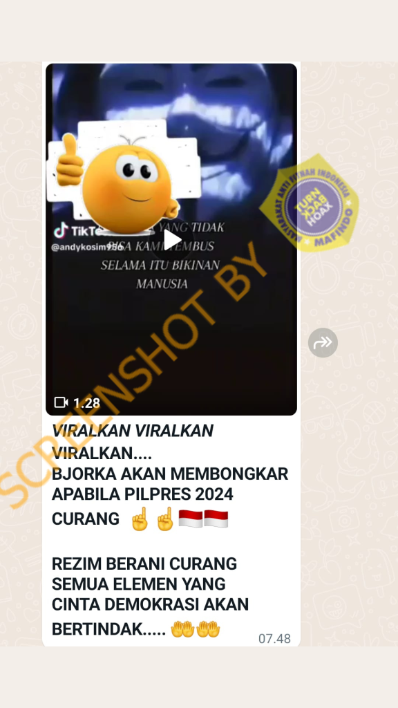 Sebuah video beredar di media perpesanan Whatsapp. Video tersebut menampilkan sosok anonymous yang diklaim merupakan Bjorka. Video tersebut disebarkan dengan klaim bahwa Bjorka akan membongkar apabila pada Pemilu 2024 terdapat kecurangan.