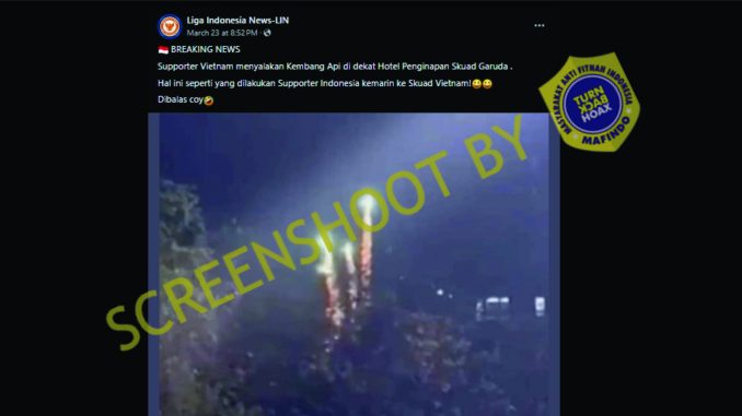 Beredar sebuah postingan di Facebook yang memperlihatkan sebuah foto dan narasi yang mengklaim jika suporter Vietnam menyalakan sebuah kembang api di dekat hotel tempat para pemain Indonesia menginap untuk mengganggu waktu istirahat mereka.
