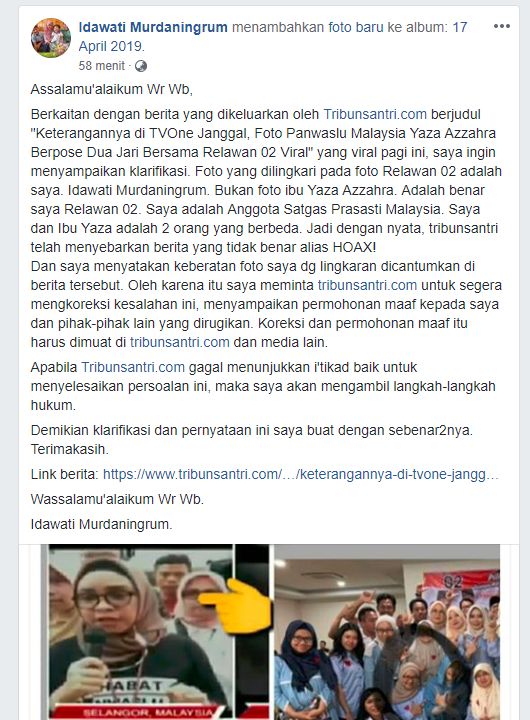 Berkaitan dengan berita yang dikeluarkan oleh Tribunsantri.com berjudul “Keterangannya di TVOne Janggal, Foto Panwaslu Malaysia Yaza Azzahra Berpose Dua Jari Bersama Relawan 02 Viral” yang viral pagi ini, saya ingin menyampaikan klarifikasi. Foto yang dilingkari pada foto Relawan 02 adalah saya. Idawati Murdaningrum. Bukan foto ibu Yaza Azzahra. Adalah benar saya Relawan 02. Saya adalah Anggota Satgas Prasasti Malaysia. Saya dan Ibu Yaza adalah 2 orang yang berbeda. Jadi dengan nyata, tribunsantri telah menyebarkan berita yang tidak benar alias HOAX!