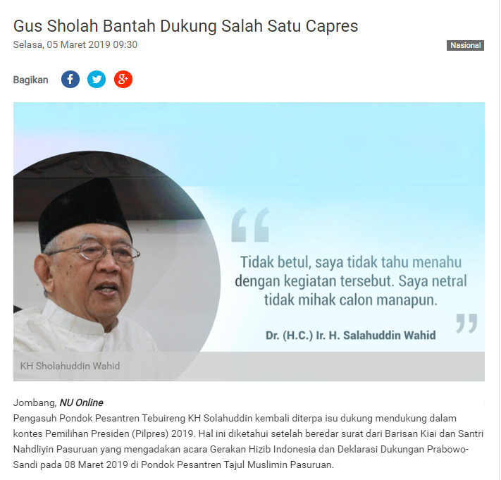 Ini bukan kali pertama Gus Sholah diterpa isu seperti ini. Dan dari artikel yang dimuat di situs resmi milik Nahdlatul Ulama ( nu.or.id ), Gus Sholah menegaskan bahwa dia bersikap netral. Pernyataan ini juga disampaikan saat adik kandung Gus Dur ini ditemui Kompas.com di kediamannya.