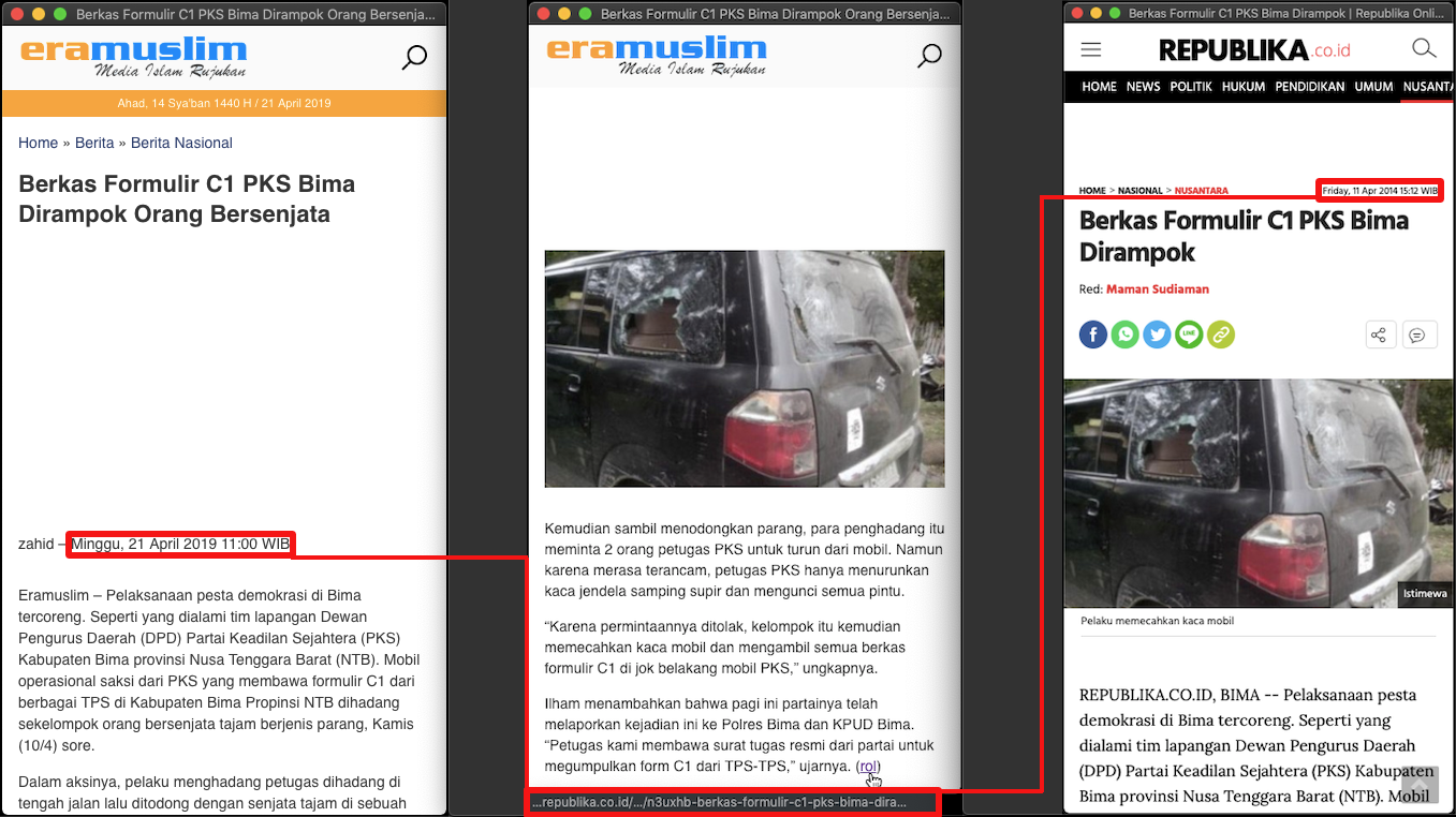 Share Facebook HASIL CEK FAKTA Artikel yang disalin oleh situs Eramuslim adalah berita tahun 2014, selengkapnya di bagian PENJELASAN dan REFERENSI. KESIMPULAN Rujukan https://turnbackhoax.id/2019/04/21/salah-eramuslim-berkas-formulir-c1-pks-bima-dirampok/ Publish date : 2019-04-21