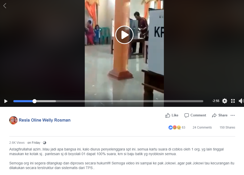 Video berdurasi 3:17 menit itu memperlihatkan seorang pria berbaju batik berada di bilik suara. Pria tersebut tampak sibuk memeriksa beberapa kertas. Seorang pria berpeci dan mengenakan kain sarung berdiri di samping kiri sang pria barbaju batik. Video tersebut dibagikan oleh akun Resla Oline Welly Rosman, Jumat 19 April 2019.