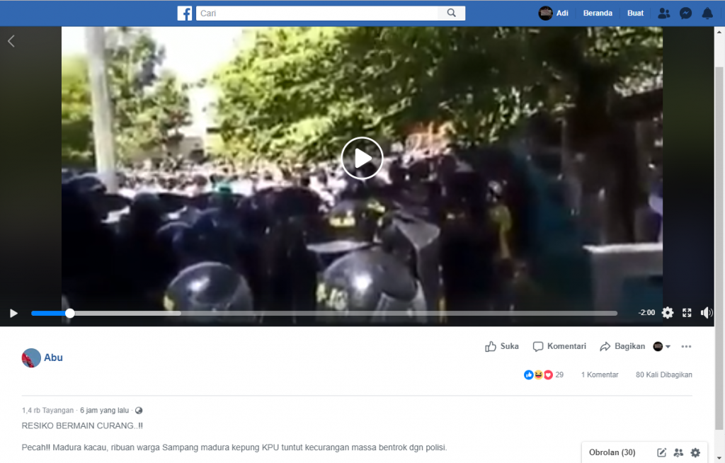Video kericuhan yang menyebut ribuan warga mengepung kantor Komisi Pemilihan Umum Sampang, Madura, Jawa Timur, beredar di media sosial pada Senin, 22 April 2019. Video ini diberi narasi :