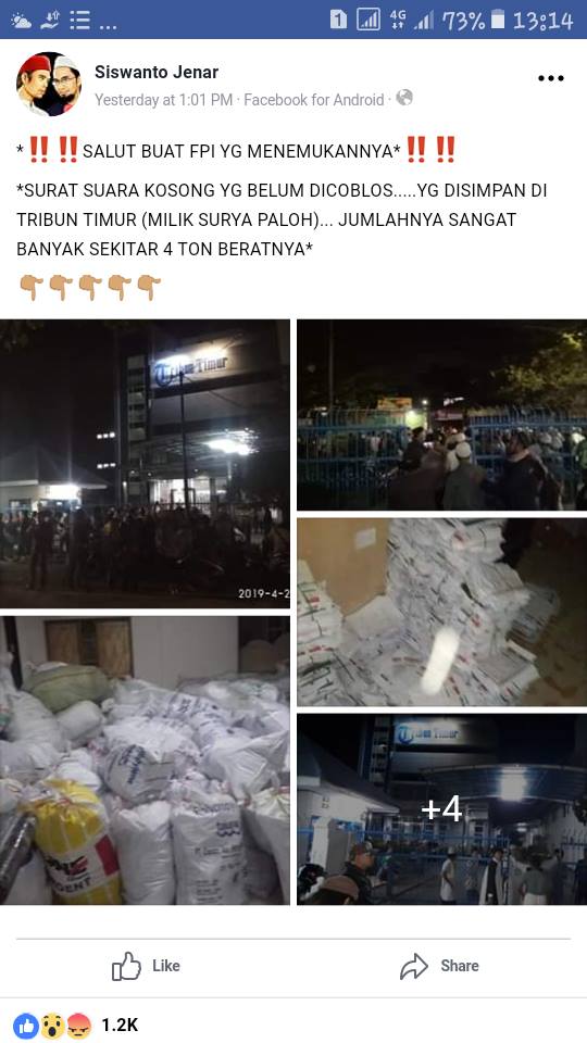 Beredar informasi di media sosial perihal adanya temuan 4 ton surat suara kosong oleh FPI yang belum tercoblos disimpan di gudang percetakan Tribun Timur milik PT Kompas Gramedia, Jl Cendrawasih, Kota Makassar, Sulawesi Selatan.