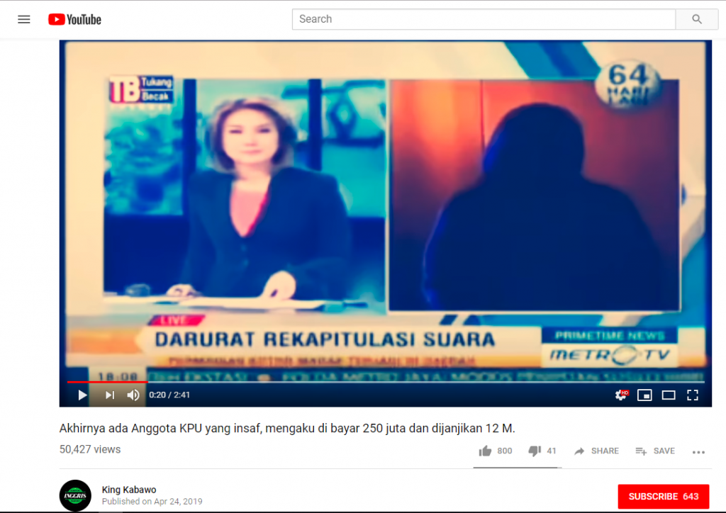 ( youtube.com/channel/UC1_cO1Rc46OoK4tbw2UYNVA ) pada tanggal 24 April 2019 dengan judul “Akhirnya ada Anggota KPU yang insaf, mengaku di bayar 250 juta dan dijanjikan 12 M.”. Video ini diberi keterangan “Akhirnya ada Anggota KPU yang insaf, mengaku di bayar 250 juta dan dijanjikan 12 M. Saksikan wawancara ekslusifnya di MetroTV.”