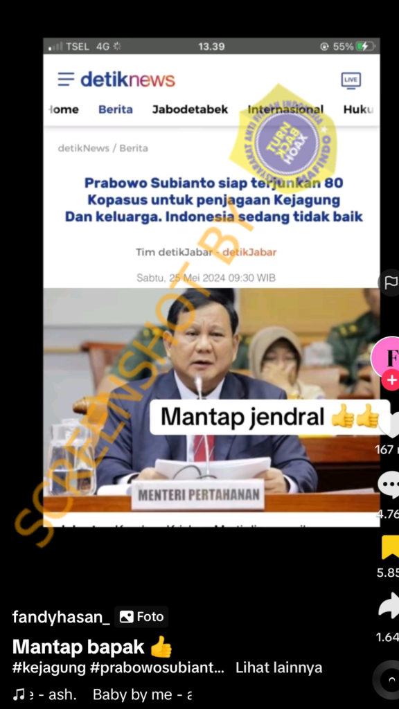 Sebuah akun Tiktok dengan nama @fandyhasan_ mengunggah sebuah tangkapan layar berita di situs Detik News dengan judul “Prabowo Subianto siap terjunkan 80 Kopasus untuk penjagaan Kejagung Dan keluarga, Indonesia sedang tidak baik.”