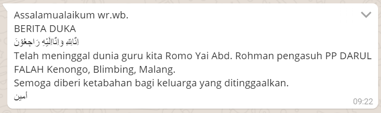 Telah meninggal dunia guru kita Romo Yai Abd. Rohman pengasuh PP DARUL FALAH Kenongo, Blimbing, Malang.