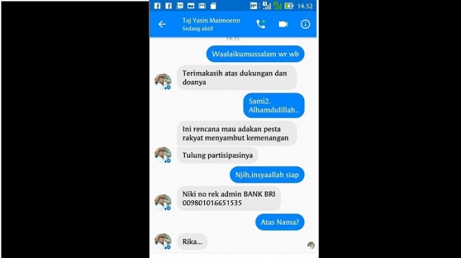 Sebuah akun Facebook mengatasnamakan calon wakil gubernur Jawa Tengah, Taj Yasin berusaha meminta sumbangan melalui pesan Facebook.