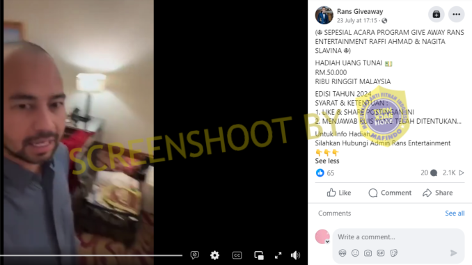 Beredar sebuah akun Facebook bernama “Rans Giveaway” yang mengunggah video Raffi Ahmad berbicara soal Rans Entertainment yang akan berbagi hadiah mulai dari uang hingga motor.