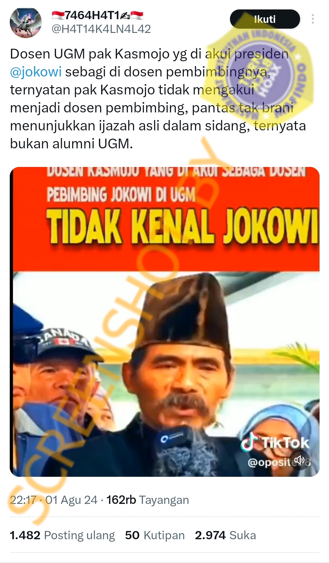 Sebuah narasi beredar melalui media sosial X. Narasi dari akun @H4T14K4LN4L42, menuliskan sebuah informasi yang menyebutkan bahwa Dosen UGM bernama Bapak Kasmujo yang diakui oleh Jokowi sebagai dosen pembimbingnya, ternyata tidak mengakui Jokowi sebagai mahasiswa bimbingannya. Informasi ini didapatkan dari keterangan seorang pria paruh baya dalam video yang turut diunggah oleh akun X ini. Lalu apakah benar, Bapak Kasmujo tidak mengakui Jokowi sebagai mahasiswa bimbingannya?