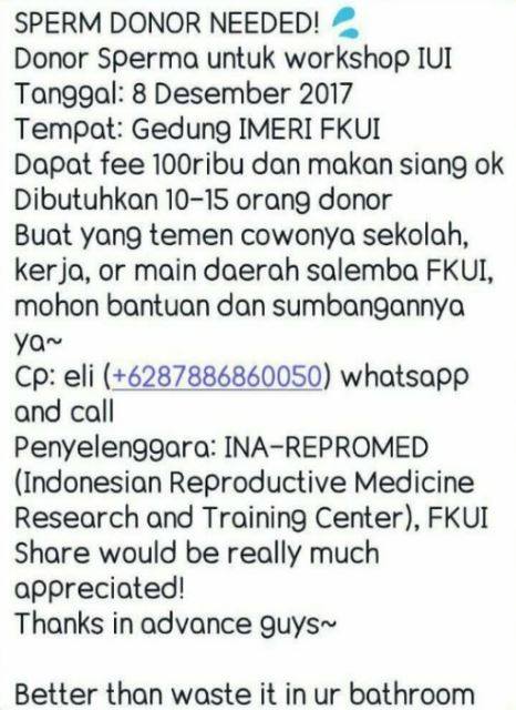 Diketahui, hoax terkait donor sperma juga pernah dihubungkan dengan Fakultas Kedokteran Universitas Gajah Mada (UGM) pada tahun 2015. Informasi yang tersebar melalui pesan whatssap ini menjanjikan pendonornya mendapatkan honor sebesar Rp. 50.000.