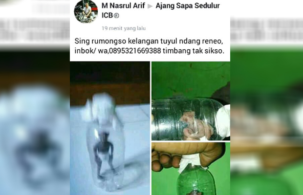 “Sing rumongso kelangan tuyul ndang reneo, inbok/ wa,08595321669388 timbang tak sikso,” tulis M Nasrul Arif.