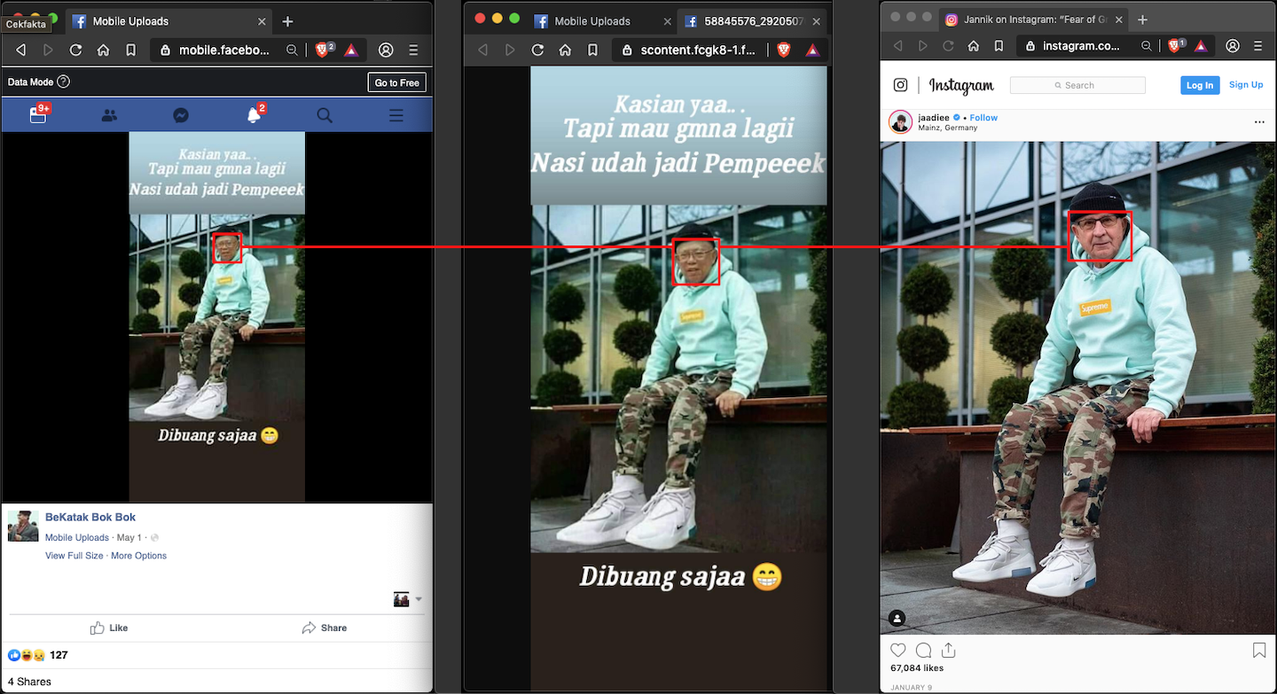 Share Facebook Berita Foto Ma'ruf Amin hasil suntingan. HASIL CEK FAKTA Foto Ma’ruf Amin yang dibagikan oleh SUMBER adalah hasil suntingan, menggunakan foto yang sudah beredar sebelumnya di Internet. Selengkapnya di bagian PENJELASAN dan REFERENSI. KESIMPULAN Rujukan https://turnbackhoax.id/2019/05/19/salah-dibuang-sajaa/ Publish date : 2019-05-19