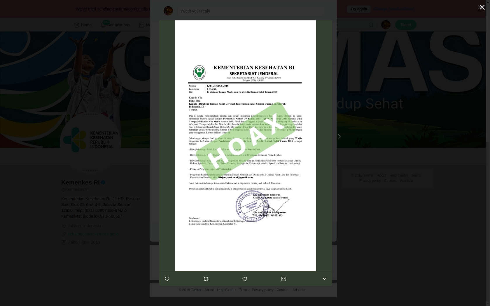 Kementerian Kesehatan melalui cuitannya di akun sosial media Twitter, mengklarifikasi beredarnya surat tersebut. "PERHATIAN: Kementerian Kesehatan RI tidak mengeluarkan surat Pendataan Tenaga Medis dan Non Medis Rumah Sakit Tahun 2018," tulis @KemenkesRI.