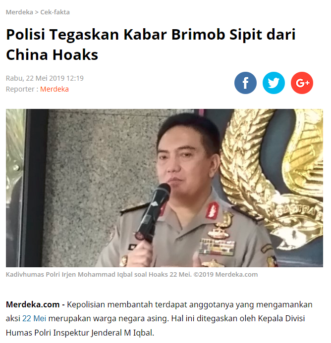 Polri menepis tuduhan tersebut. Polri menegaskan, personel Brimob yang dikerahkan semuanya adalah WNI. “Banyak foto dan anggota Polri bahwa pasukan dari negeri seberang yang bermata sipit. Kalau dilihat, saya sipit juga. Ini tidak ada, kita bantah. Murni bahwa itu personel Brimob WNI,” ujar Kadiv Humas Polri Irjen M Iqbal di Kantor Kemenko Polhukam, Jl Medan Merdeka Barat, Jakarta Pusat, Rabu (22/5/2019).