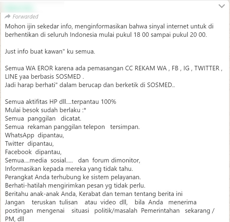 Pesan berantai berisikan upaya mematikan internet oleh pemerintah beredar sedari tanggal 18 Mei 2019. Dalam isi pesan tersebut dikatakan bahwa pemberhentian internet itu dilakukan pada pukul 18.00 hingga 20.00 WIB. Selain itu, dalam narasinya disebutkan pula bahwa segala kegiatan media sosial dipantau.