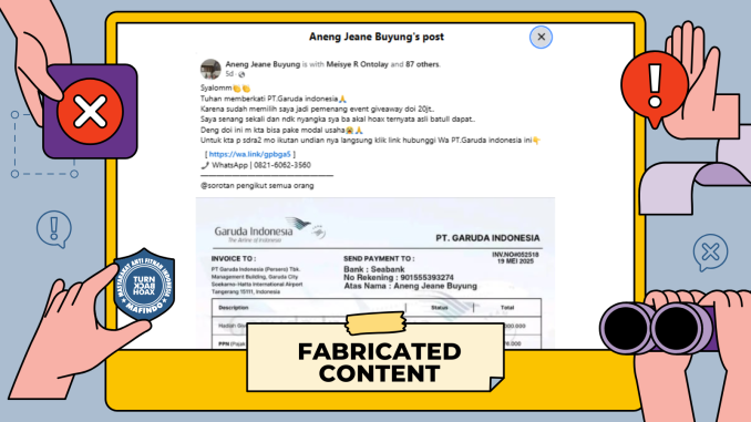 Unggahan berisi klaim “Garuda Indonesia bagi-bagi uang” merupakan konten palsu (fabricated content).