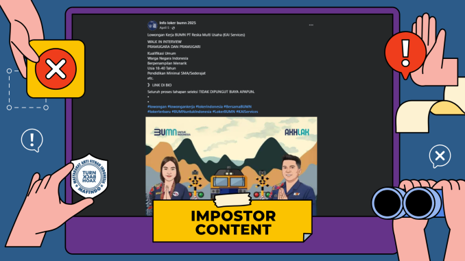 Unggahan berisi tautan “pendaftaran lowongan pekerjaan KAI Services” yang mengarah ke laman tak resmi itu merupakan konten tiruan (impostor content).