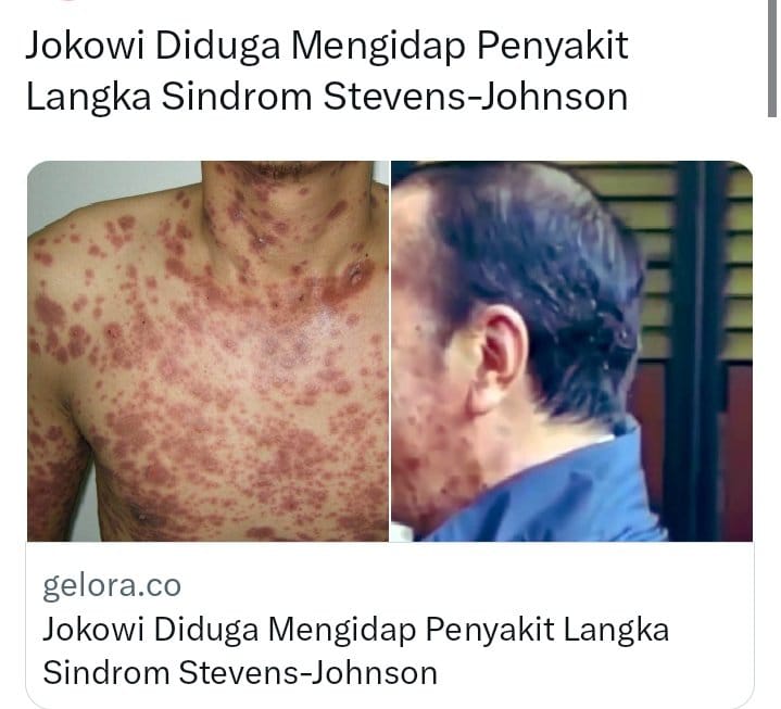 SEBUAH tangkapan layar dari berita siber Gelora.co berjudul “Jokowi Diduga Mengidap Penyakit Langka Sindrom Stevens Johnson” berisi klaim bahwa mantan Presiden Joko Widodo menderita penyakit langka beredar di media sosial X dan WhatsApp. Konten itu memuat foto Jokowi menderita penyakit kulit dan foto lain bagian tubuh dengan bercak-bercak merah. Tautan artikel di situs Gelora dapat diakses di sini.