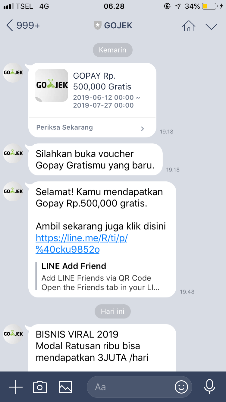 Pesan berisikan informasi pembagian voucher gratis Go-pay sebesar Rp500 ribu tersebar di media pesan LINE. Dalam pesan itu, dikatakan bahwa penerima pesan akan mendapatkan voucher Go-pay itu dengan menekan tautan yang ada dan melakukan langkah-langkah yang dianjurkan.
