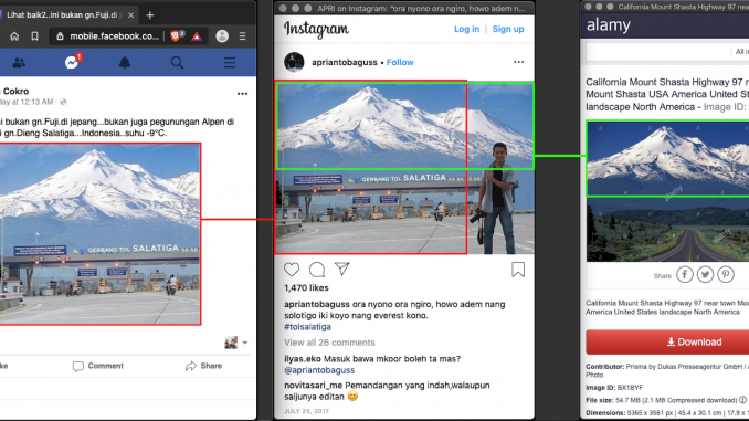 1. SUMBER membagikan foto hasil suntingan, foto Gunung Shasta di California (Amerika Serikat) digabungkan dengan foto Gerbang Tol Salatiga di Salatiga (Jawa Tengah).