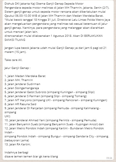 Pesan berantai mengenai sepeda motor akan dikenai aturan ganjil-genap merupakan informasi yang tidak benar. Dilansir dari jawapos.com, Wakil Direktur Lalu Lintas Polda Metro Jaya AKBP Nuhandono menegaskan, berita yang tersebar terkait sepeda motor harus mengikuti sistem ganjil-genap adalah hoaks. “Tidak benar itu, ya hoaks. Kita fokus untuk kendaraan roda empat, tidak ada kendaraan roda dua yang kena ganjil-genap,” ujarnya.