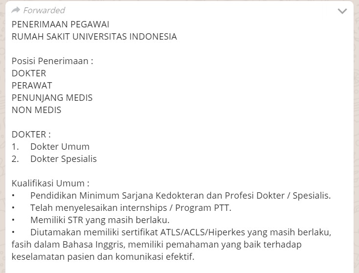 Informasi lowongan pekerjaan di Rumah Sakit Universitas Indonesia (RSUI) yang beredar di media pesan Whatsapp dan media sosial merupakan kabar bohong atau hoaks. Sebab, melalui akun media sosial Twitter resmiya, UI telah mengklarifikasi bahwa informasi tersebut tidak benar.