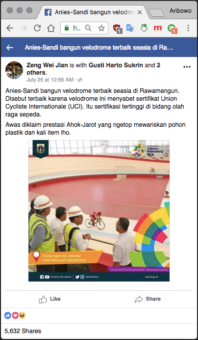 "Anies-Sandi bangun velodrome terbaik seasia di Rawamangun. Disebut terbaik karena velodrome ini menyabet sertifikat Union Cycliste Internationale (UCI). Itu sertifikasi tertinggi di bidang olah raga sepeda.