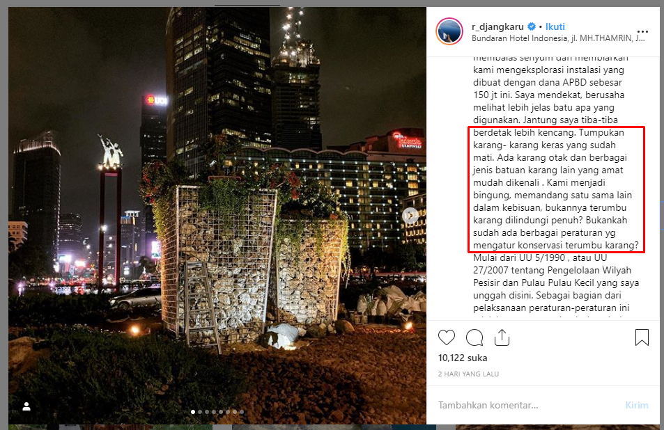 “Tumpukan karang- karang keras yang sudah mati. Ada karang otak dan berbagai jenis batuan karang lain yang amat mudah dikenali . Kami menjadi bingung, memandang satu sama lain dalam kebisuan, bukannya terumbu karang dilindungi penuh? Bukankah sudah ada berbagai peraturan yg mengatur konservasi terumbu karang?” tulis Riyanni Djangkaru di akun @r_djangkaru.