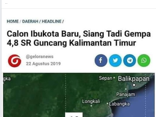 Beredar informasi di media sosial tentang gempa berkekuatan 4,8 Skala Richter (SR) yang melanda Kabupaten Paser, kabupaten di Kalimantan Timur yang berbatasan dengan Kabupaten Penajam Paser Utara, lokasi ibu kota baru, pada 22 Agustus 2019.