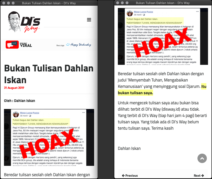 Berdasarkan klarifikasi oleh yang terkait, tulisan tersebut BUKAN tulisan Dahlan Iskan.