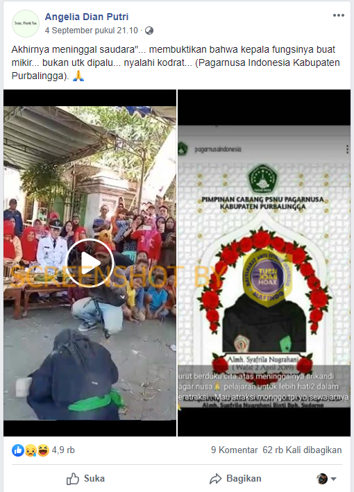 Selain video, unggahan itu juga dilengkapi dengan gambar berisi ucapan duka dari Pimpinan Cabang Pencak Silat Nahdlatul Ulama Pagar Nusa Kabupaten Purbalingga atas meninggalnya seseorang yang bernama Syafrila Nugrahani pada 2 April 2019.