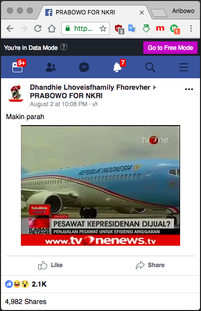 Menggunakan foto tayangan TV One dengan caption "PESAWAT KEPRESIDENAN DIJUAL? PENJUALAN PESAWAT UNTUK EFISIENSI ANGGARAN".