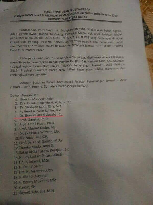 Forum yang dikukuhkan oleh Ketua Dewan Pembina Relawan Jokowi (Rejo), Sidarto Danusubroto, memasukkan sejumlah nama penting di Sumbar sebagai pengurus.