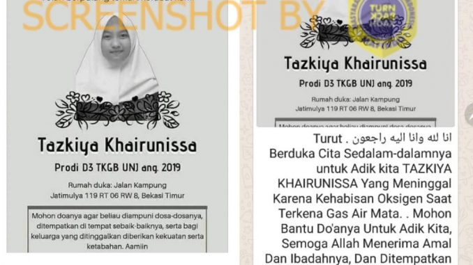 Tazkiya meninggal karena sakit yang dideritanya, bukan karena gas air mata karena ia tidak mengikuti aksi di DPR. Selengkapnya di bagian PENJELASAN dan REFERENSI