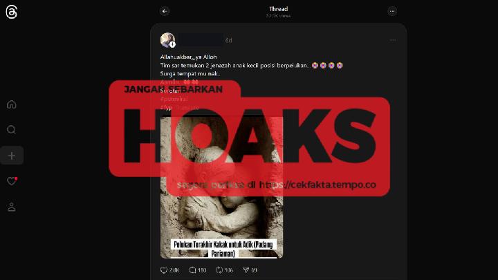 FOTO dengan klaim penemuan jenazah kakak dan adik dalam kondisi berpelukan beredar di Facebook, Instagram, Threads [arsip] dan X pada akhir Desember 2025. Narasi unggahan menyebutkan keduanya tewas akibat bencana tanah longsor di Kabupaten Padang Pariaman, Sumatra Barat.
