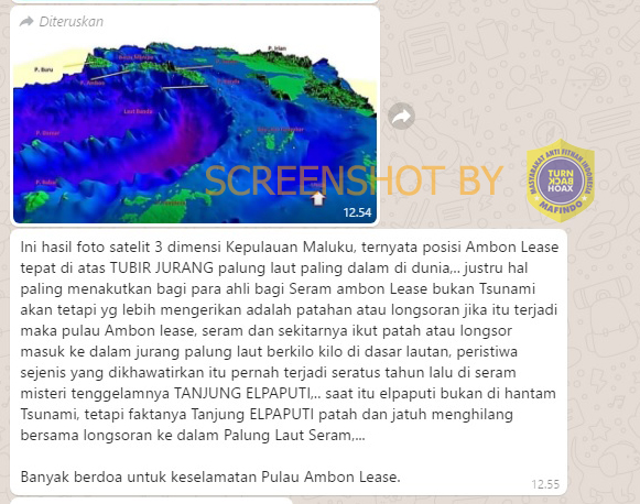 Beredar informasi yang menyebutkan Kepulauan Maluku (Ambon dan Seram) akan tenggelam ke palung laut. Hal itu diklaim berdasarkan foto citraan satelit yang diedarkan melalui pesan berantai tersebut melalui Whatsapp.