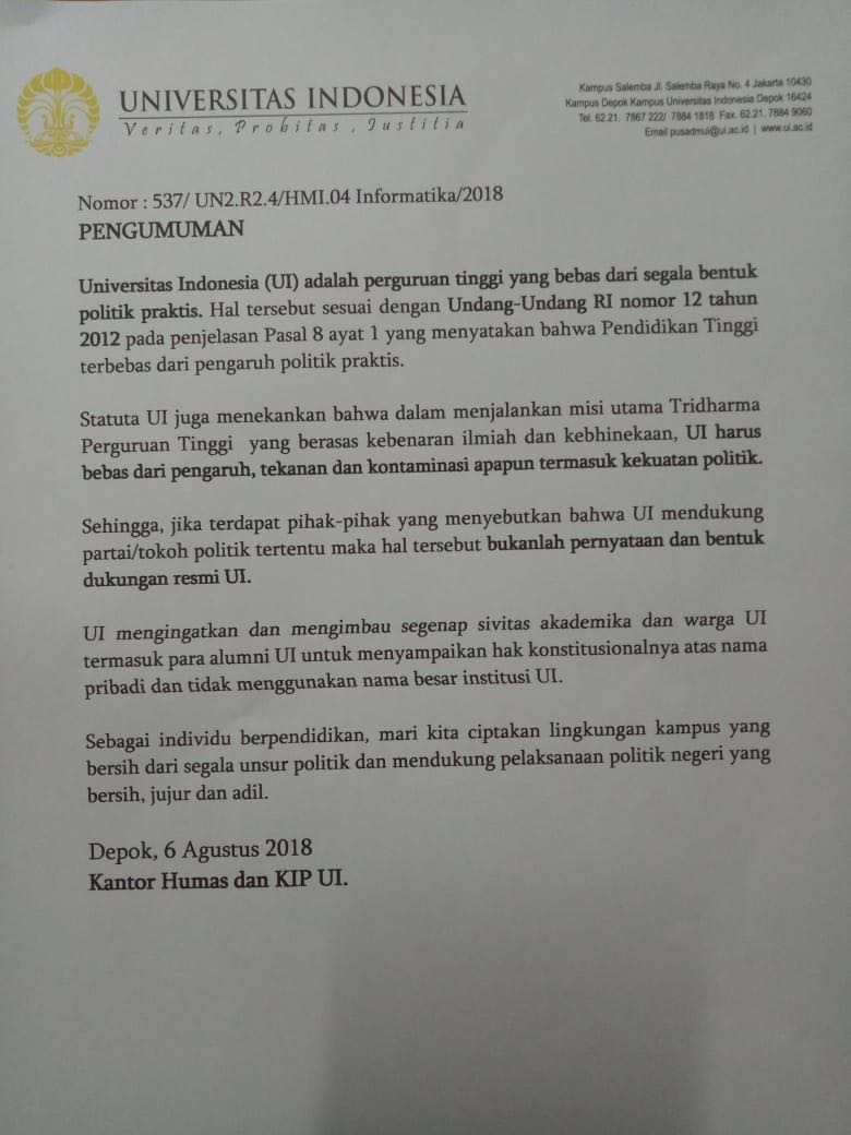 Atas munculnya video dukungan kepada calon presiden tertentu oleh segelintir oknum mengatasnamakan alumni Universitas Indonesia (UI) di media sosial, maka pihak kampus pun angat bicara. Dilansir dari tempo.co, merdeka.com, dan detik.com, Kepala Kantor Humas dan KIP Universitas Indonesia (UI) Rifelly Dewi Astuti menegaskan, lembaganya bebas dari segala bentuk politik praktis menjelang Pemilihan Presiden atau Pilpres 2019. Rifelly menjelaskan, sikap itu tertuang lewat surat pengumuman resmi bertanggal 6 Agustus 2018 dengan nomor: 537/ UN2.R2.4/HMI.04 Informatika/2018. “Statuta UI juga menekankan bahwa dalam menjalankan misi utama Tridharma Perguruan Tinggi yang berasas kebenaran ilmiah dan kebhinekaan, UI harus bebas dari pengaruh, tekanan dan kontaminasi apapun termasuk kekuatan politik,” tutur Rifelly.